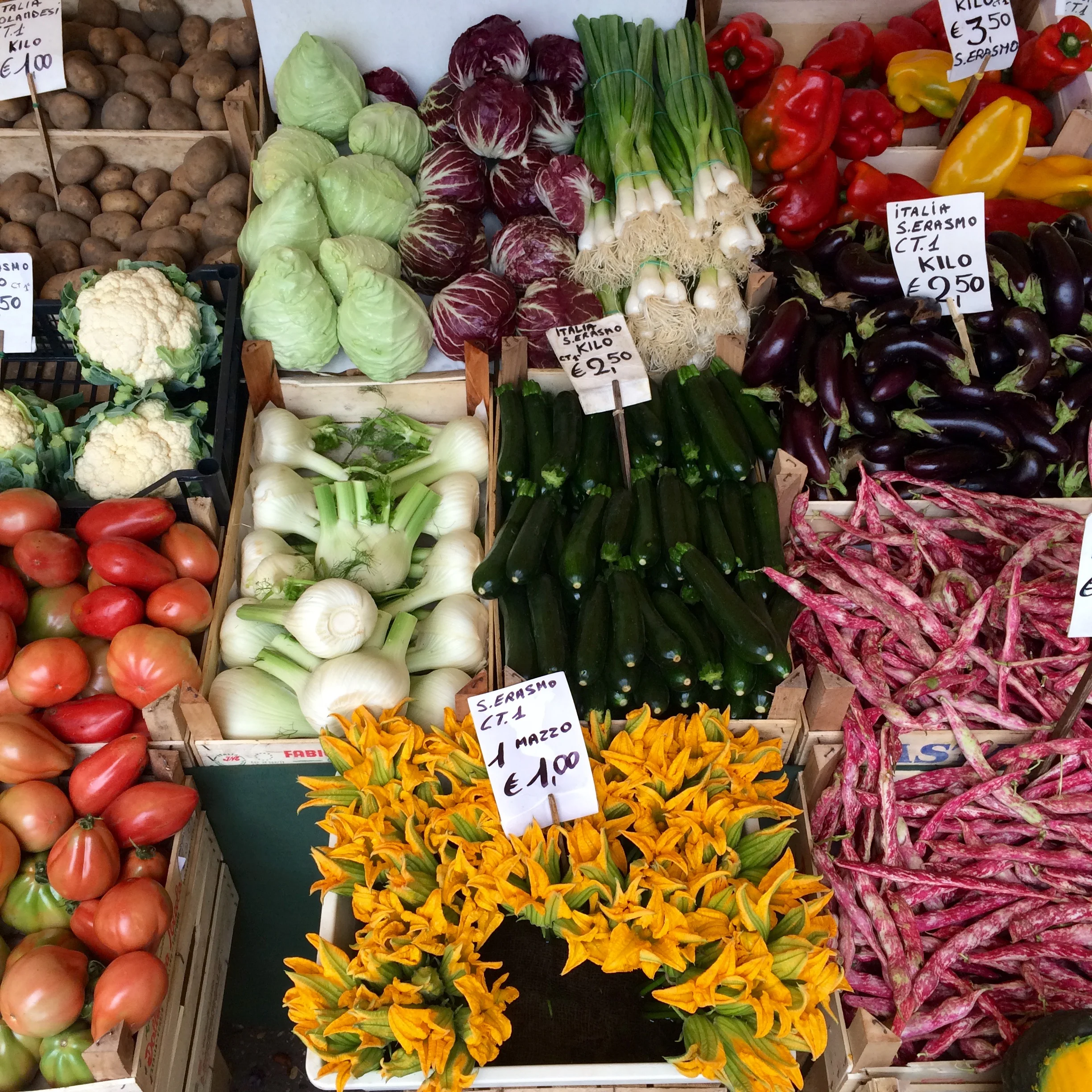 We stayed in Florence for a long time and rented a charming garden apartment near Santa Croce. The garden aspect of this apartment was something I really looked forward to. From the streets in the city centre of Florence, you can't see any gardens. All you see are tall, narrow apartment buildings, one after the other. The idea of gardens being tucked away behind these ancient apartment buildings was so exciting to me. After all, I do love nooks and crannies. Since this would be our home for a week or so, the market shopping I did here was actually at good ole fashioned grocery stores. And they did not disappoint. For breakfast I picked up farm fresh eggs (look for "azienda"), arugula, parmigiano reggiano, and sausage to scramble together. You can buy pre-packaged and pre-cooked sausage to make things faster in morning, but we prefer to buy the ones made fresh by the butcher that morning. Thankfully, you don't have to go to a separate butcher shop to get great meat in Italy. Most grocery stores have a butcher onsite and, as you would expect from Italians, they take this stuff seriously. I also picked out some cabbage and peppers to use instead of arugula on some mornings.